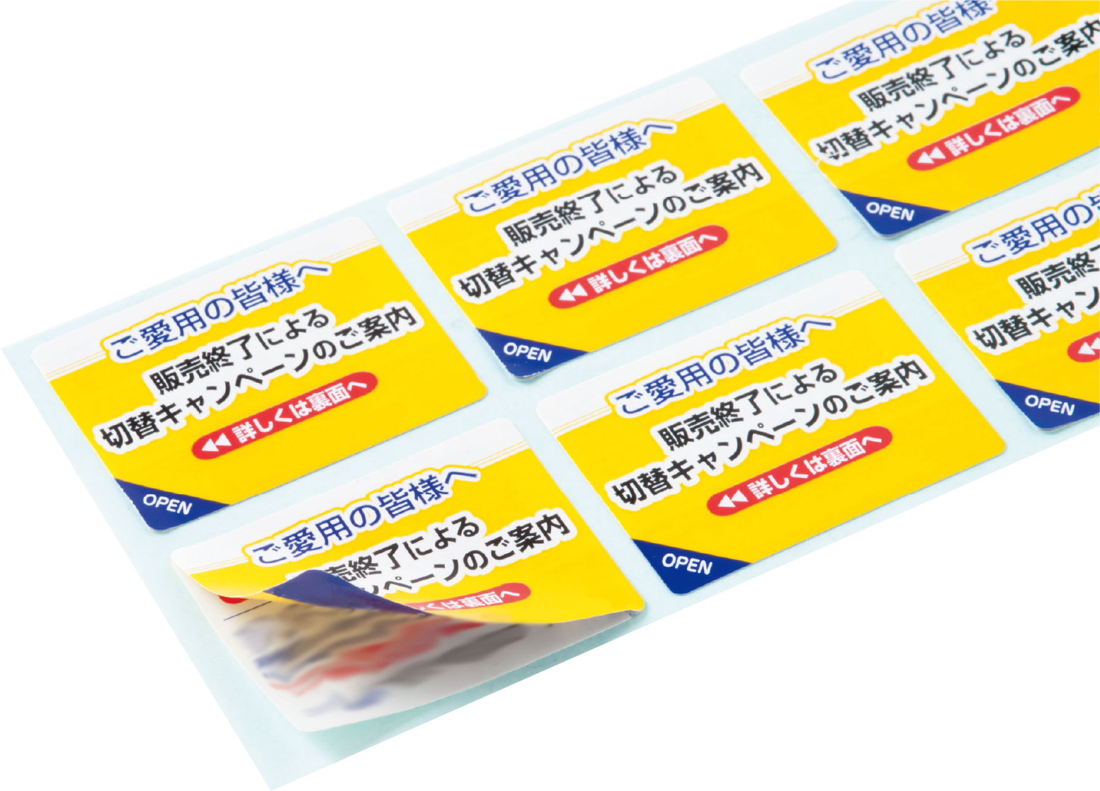 POPラベルの一種で、商品のデザインや表示が隠れずに貼れる高品質なシールです。複数の素材を貼り合わせているため、折れにくく、汚れにくいため、長時間売り場に置いていても商品の魅力を損なわずに販促効果を高めることができます。