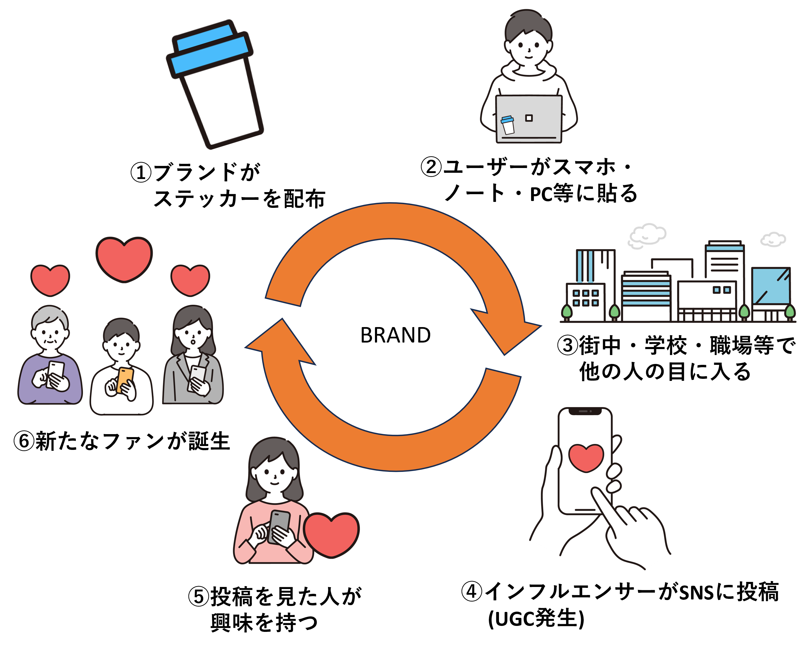 限定デザインやブランドメッセージを表現したステッカーをイベントなどに合わせて配布する施策です。配布されたステッカーがスマホやノートなどに貼られ、街中で多くの人の目に触れられることや、SNS投稿を通じてブランドの世界観やメッセージが自然に広がっていきます。実際に海外のカフェチェーンやアパレルブランドでは、「貼りたくなる・見せたくなる」ようなデザイン性の高いステッカーを活用し、来店促進やUGCの増加につなげています。
