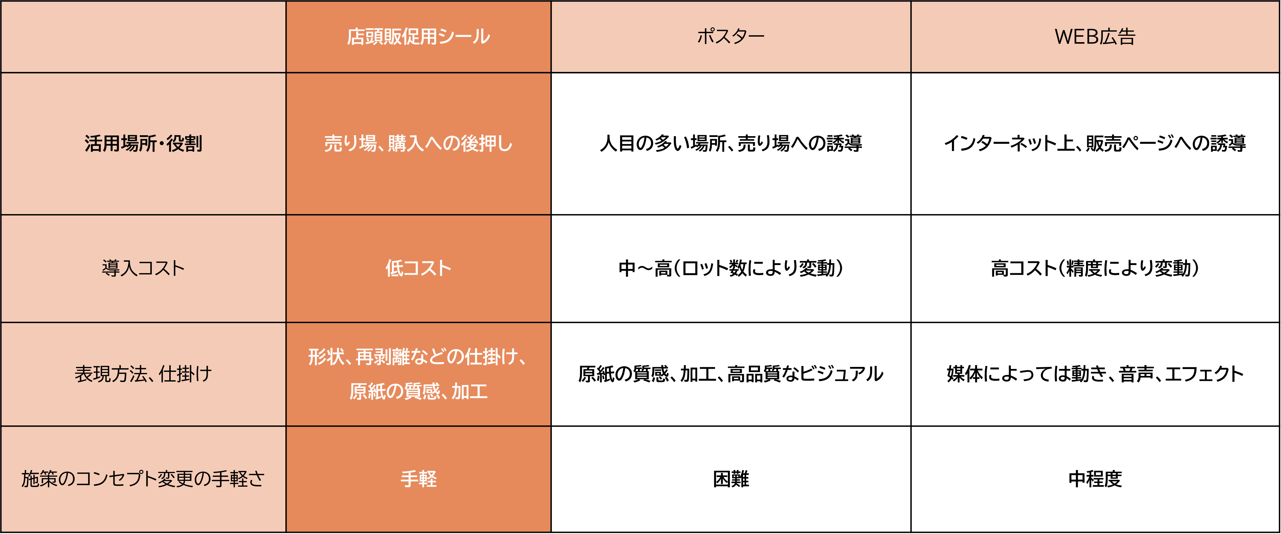 ここでシールが販促物として多く使用されている理由を他の販促物と比較してみることにました。